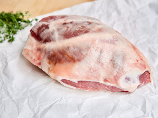 Achterschenkel van het Kamper lam. Populair stoofvlees, dat na lang garen heerlijk mals en zoet van het bot komt. Net als schouder vormt de schenkel een bijzonder vergevend stuk vlees: met een langzame garing op lage temperatuur kan er eigenlijk niets fout gaan. Mooie vorm om te serveren.